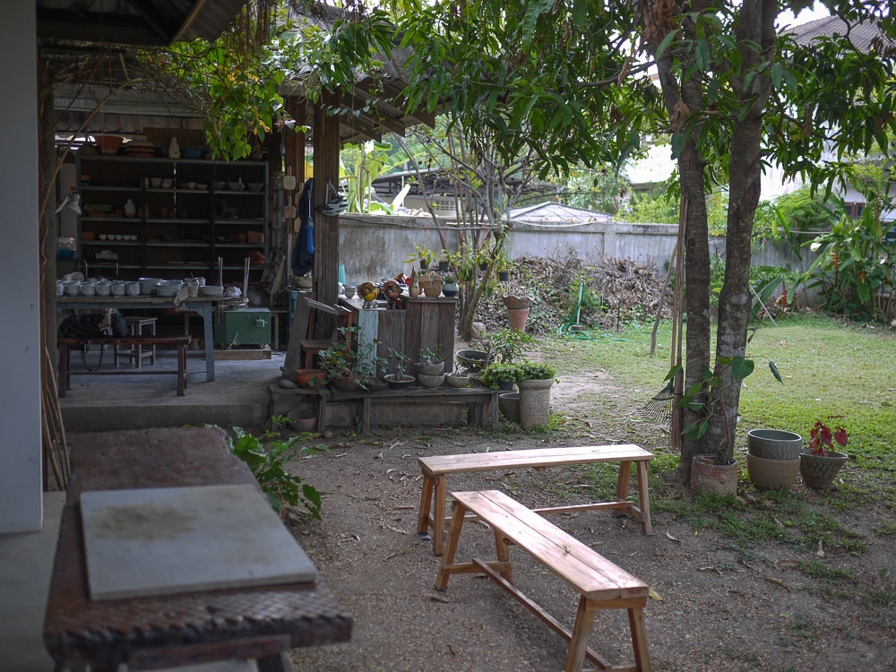 I first visited InClay's open-air workspace situated in the garden of Jirawong's family home near Chiang Mai's Wat Suan Dok Buddhist temple in 2013. The studio is located in a central section of the city, yet I arrived in a round-about way with the driver of a red truck taxi unique to Chiang Mai. I was later warmly greeted in Jirawong's gentle manner near the gate of his house. Before long, I became a weekly regular at InClay where pet chickens and roosters roam and peck at the tropical grounds. Artist friends of Jirawong's drop by and have a snack, play the guitar, and work on ceramic projects.