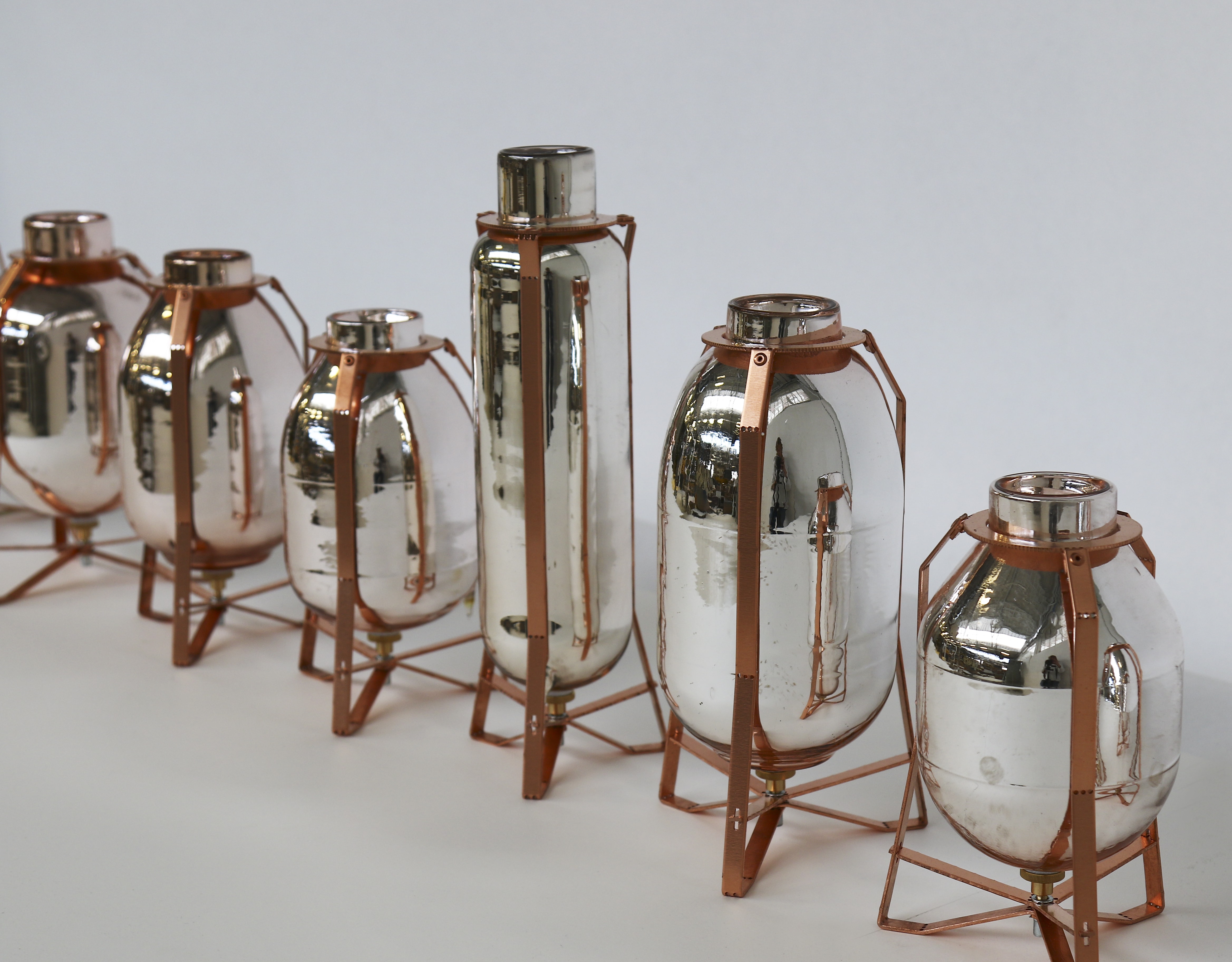 "These beautiful, double-walled thermos jugs had been gathering dust...in our basement for years. I don’t know exactly how it happened, but one day Jeanine [Eek-Keizer, the wife of Piet Hein Eek] decided that they were bad luck and they had to go. I’m not superstitious, so I thought I’d take them to the office to solve the problem and turn the silvered inner chambers of the jugs into vases. We developed a system that would allow us to produce frames for the vases, in different shapes and sizes, relatively easily. Production will stay limited to the 44 pieces that we have now, which come in 16 different shapes."PIET HEIN EEK