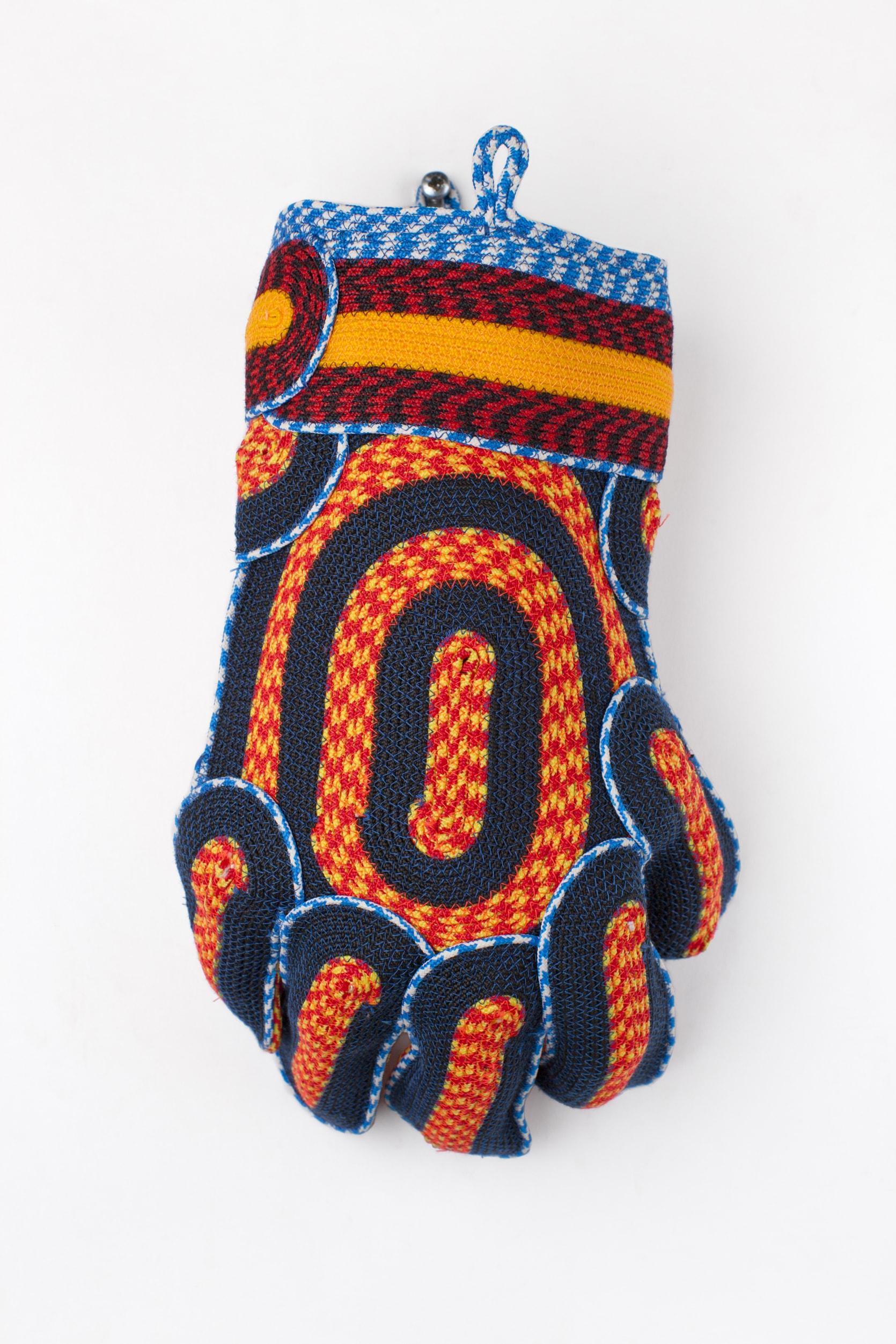 As part of the Textiel Museum Collection, designer Berjan Pot presented his collection, “Mask”. Pot originally attempted to construct a flat carpet-like surface by stitching colorful cords together but, when the samples proved to be too curvy, his collaborator Vladi Rapaport suggested he instead shape the material into three dimensional mask-like textiles. Pot's pieces have color and humor; Their shapes are reminiscent of colorful ceremonial masks. Since 2010, this successful cord stitching technique (originally commissioned by the TextielLab in Tilburg, Netherlands) has been crossing boundaries of material and has even sparked a collection of gloves.