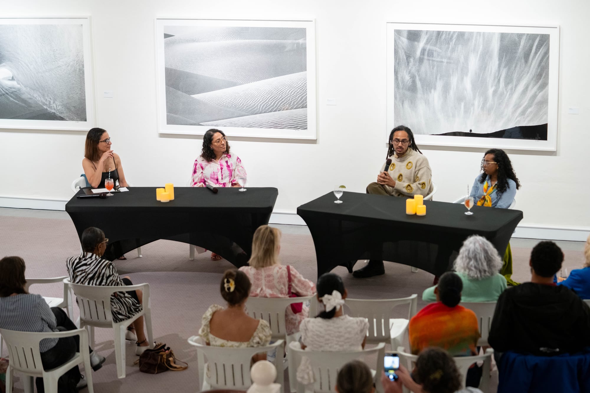 (Top, right) Bermuda National Gallery at Hamilton’s City Hall (photo by Allison Milewski) during Art for the Body: A Discussion on Wearable Art on May 30, 2025 featuring BNG Executive Director Jennifer L. Phillips (top right, seated on the left) Melanie Eddy (bottom, left), Courtney Clay (bottom, right), and Jordan Carey (top right, with mic). Photos by Brandon Morrison, courtesy of Bermuda National Gallery.