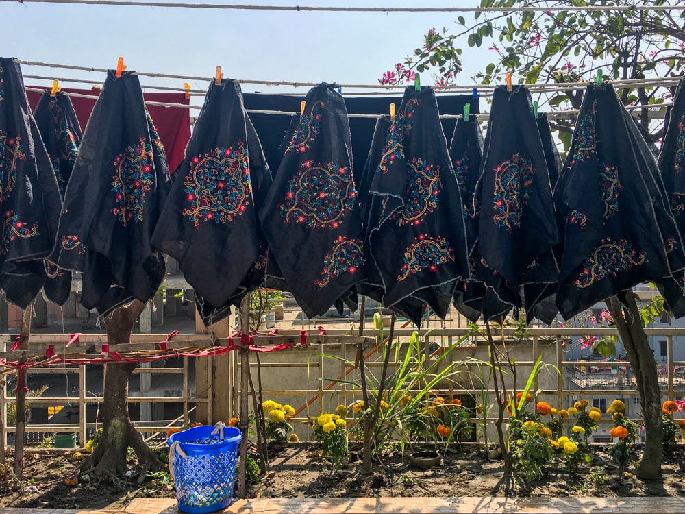 In Bangladesh, the art of embroidery finds many forms: Clothing, blankets, and arrases are adorned with colorful floral or geometric patterns — and sometimes used in a sort of figurative story-telling. Fair trade embroidery clusters (like this one in Uttara, a northern suburb of Dhaka) use techniques like mirror work, bubble stitching, dal chain stitching, and bhorat fill-up stitching as part of their masterful embroidery process.