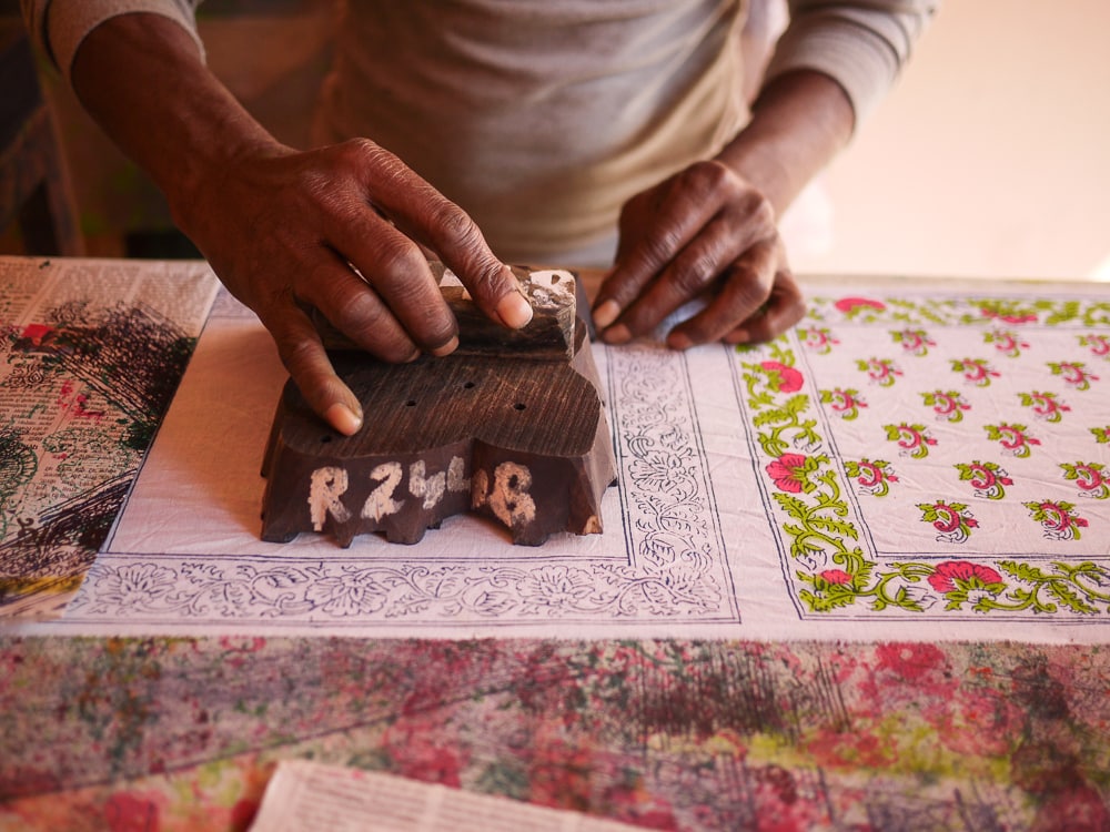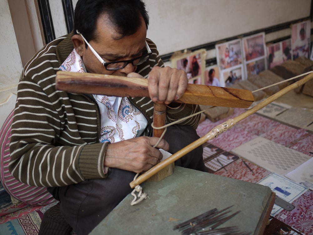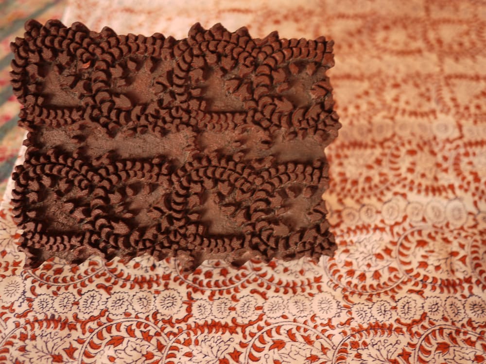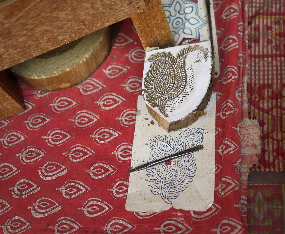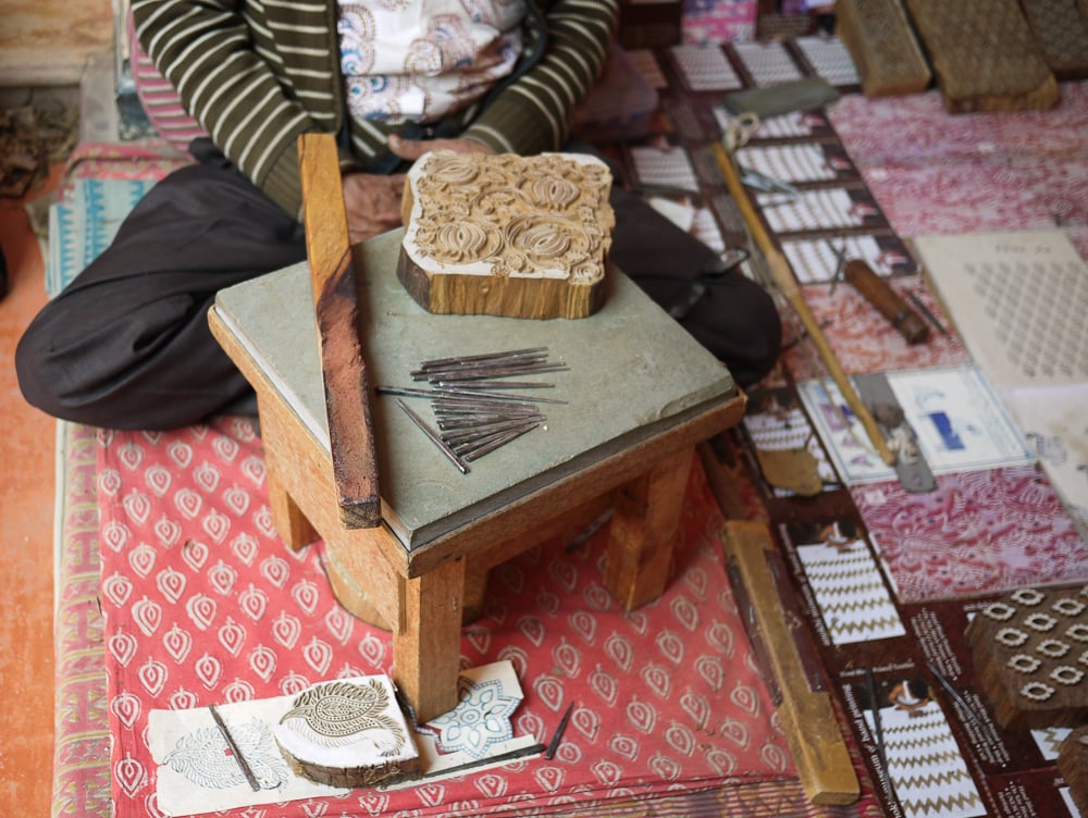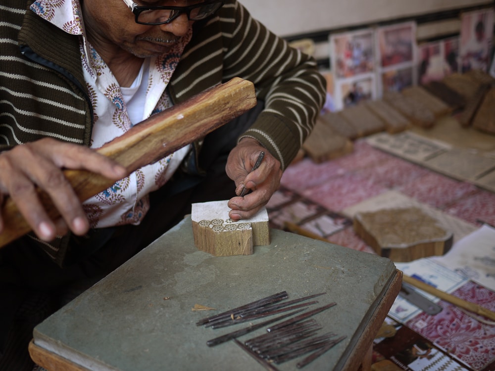 While block printing is widely believed to have originated in the 14th century, there are examples of antique Rajasthani printed cloths that date back to the 3rd century CE. Traditionally, this craft is done in a village setting in cooperation between the block carvers, chhipas printers, rangrez dyers, and dhobis washers. These images show Anokhi's resident block carver, Mujeeb Khan, working on a wood block that has been smeared with chalk paste and drawn with pencil and a paper pattern before the intricate carving process begins.