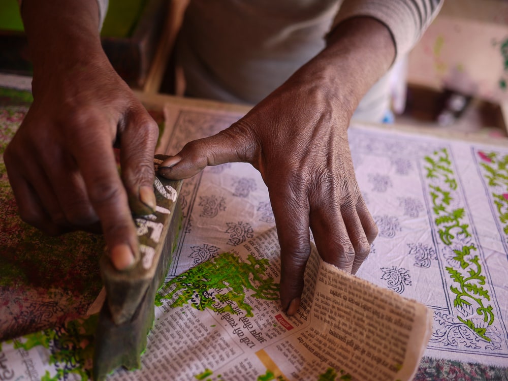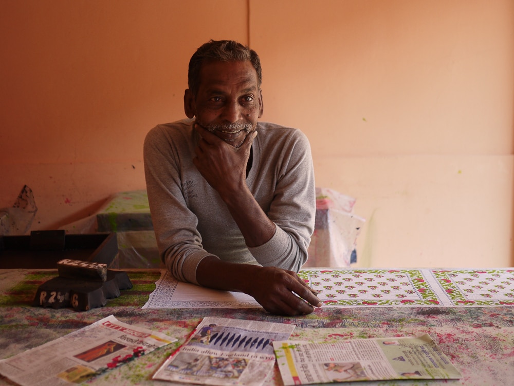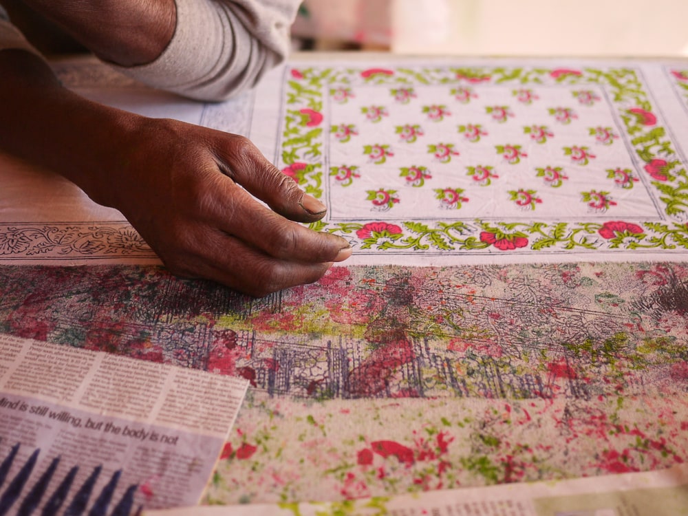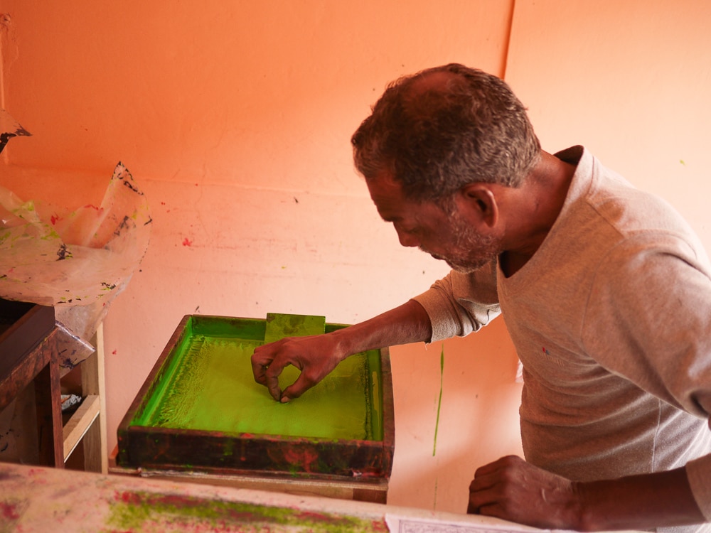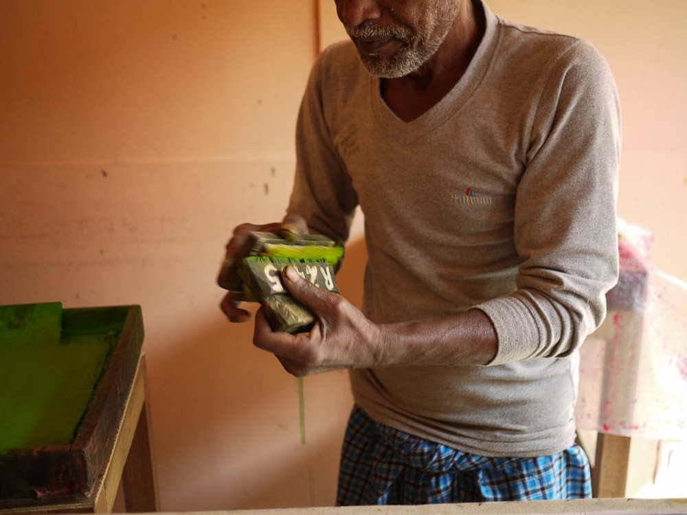 The number of blocks that a chhipa printer uses is generally determined by the number of colors in the print design. First, the printer stamps out the background block (called a gudh), followed by an outline block (the rekh). The datta are the filler blocks which complete the process and, on average, a printer uses 4 to 5 blocks to create a hand printed cloth. A complicated textile design like the 'Tree of Life' motif from Farrukhabad can utilize 200 to 300 blocks to create the fine details of the tree and its flowers and fruits. Here, Anokhi's in-house printer, Salim, is working on a floral motif using punchy lime green and flamingo pink datta blocks.