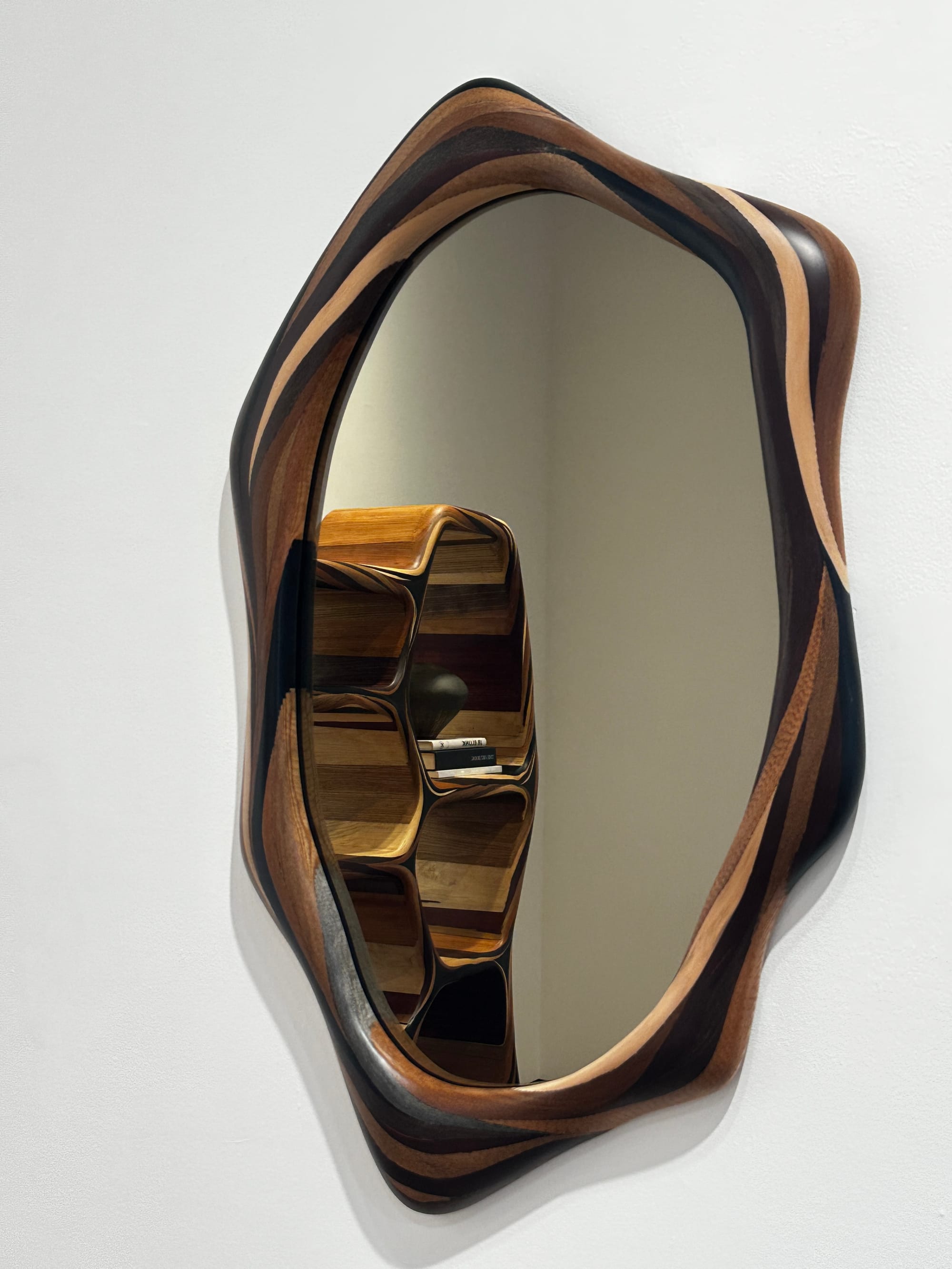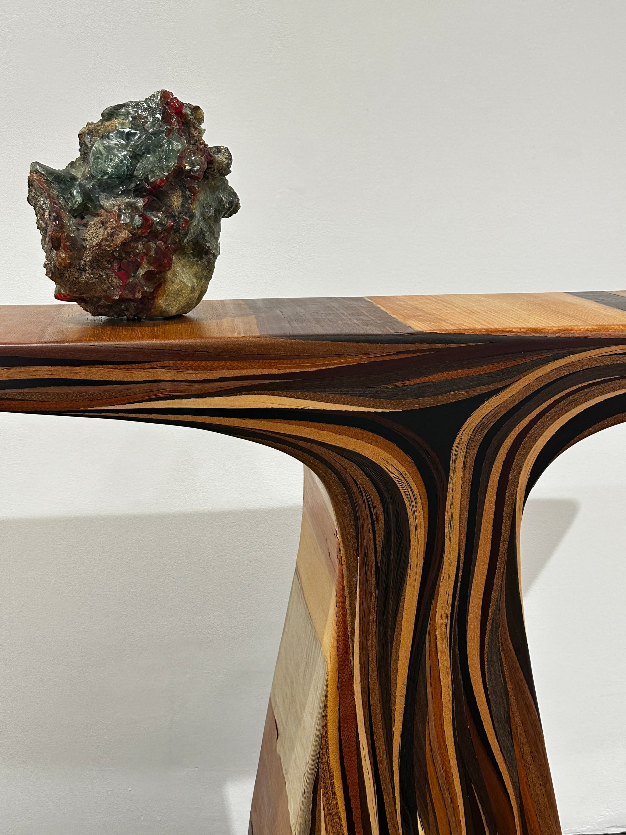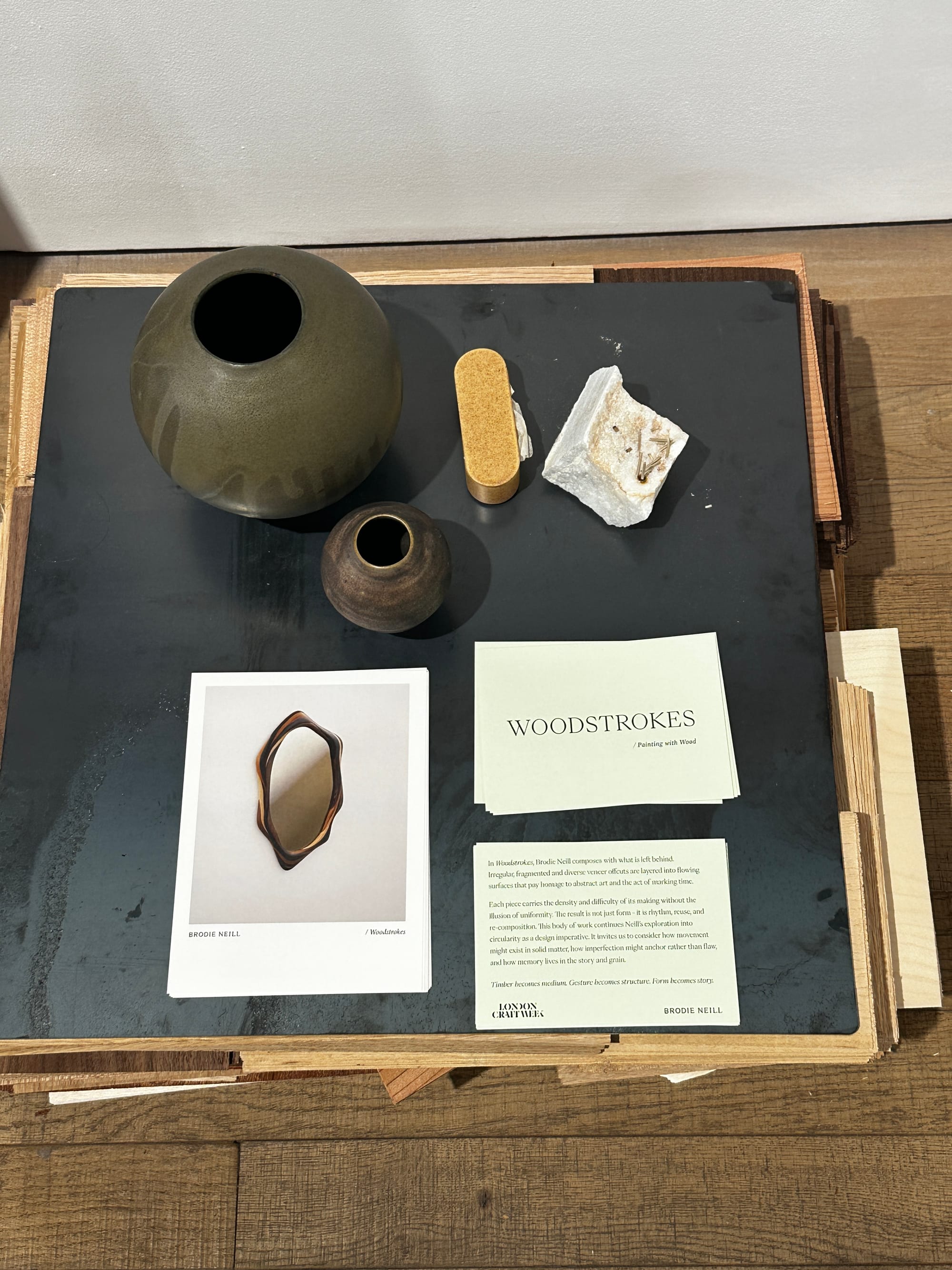 Tasmanian-born, London-based designer Brodie Neill explored irregular and fragmented veneer offcuts using circular design practices to create sculptural pieces for his 'Woodstrokes' exhibition at 9 Cork Street in Mayfair. The furniture designer and Rhode Island School of Design (RISD) graduate's experiment resulted in layered, flowing abstract functional forms.