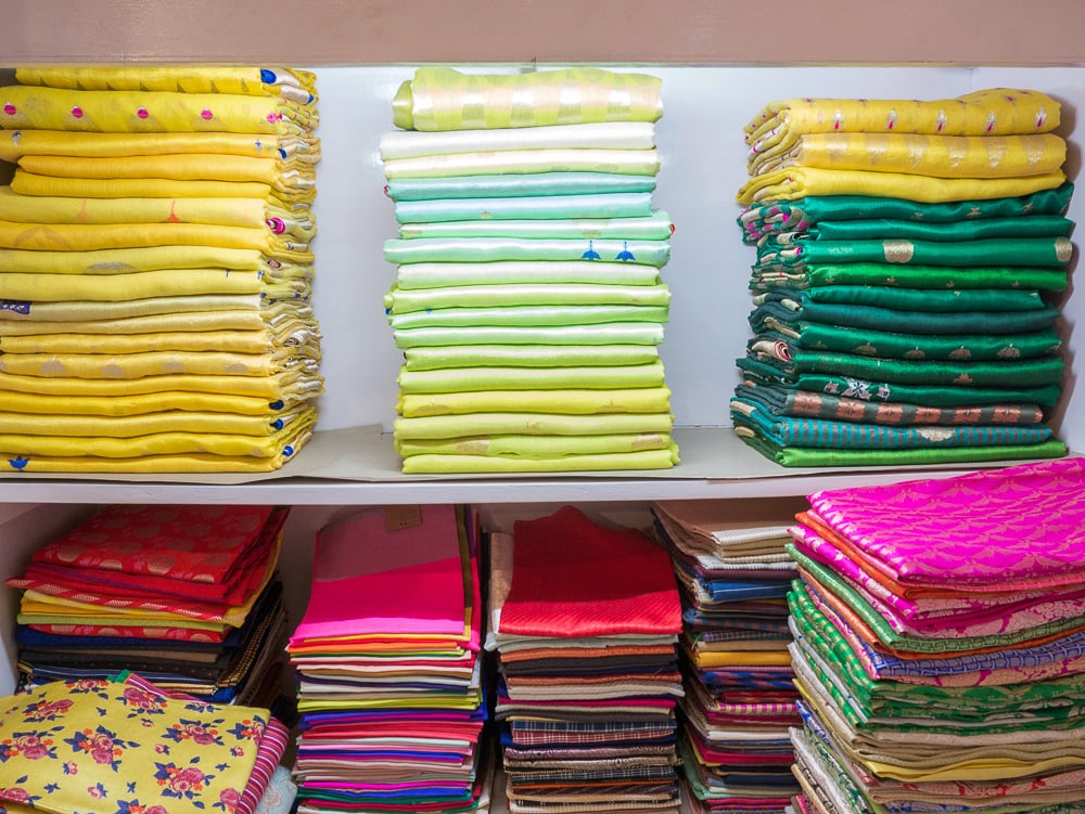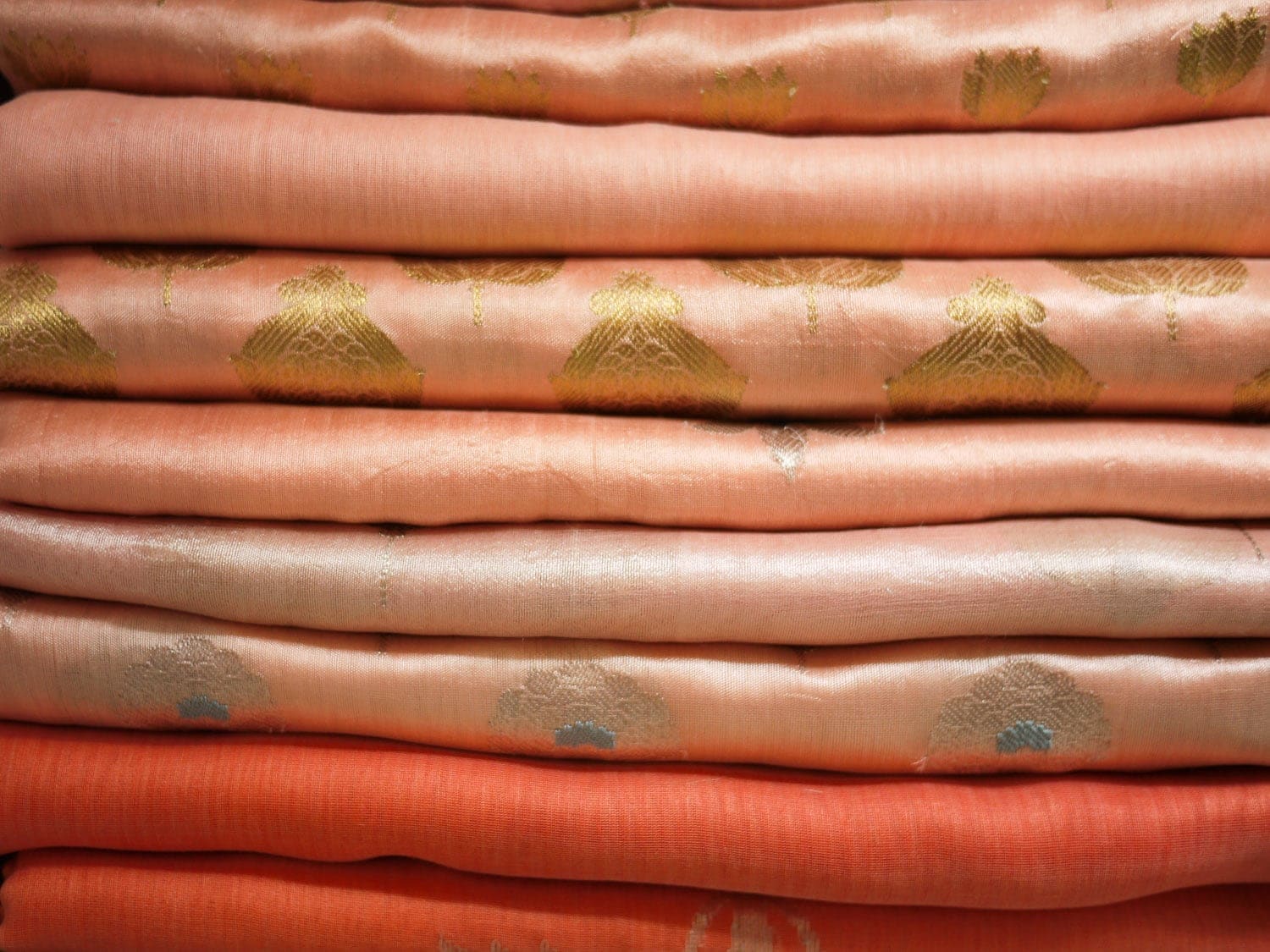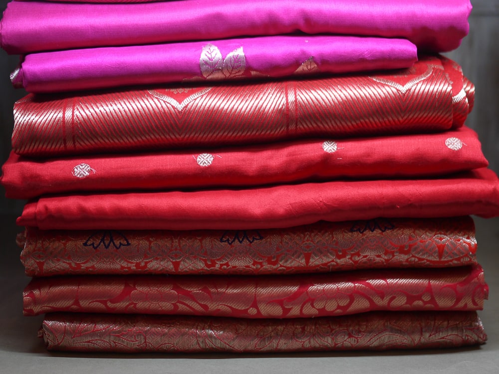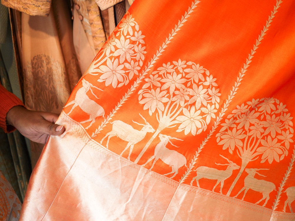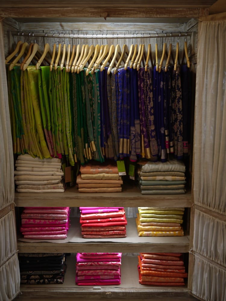 Garg’s workspace and showroom at the Ansal Villas at Angoori Badi Farm in the Chhatarpur area of New Delhi is all white and styled minimally. There is a low sofa, a natural wood table, and a jute mat on the floor. But when Sanjay opened the cupboards for us on a recent visit, a bright burst of light and rainbow of colors spilled forth. Neatly stacked silk saris and dupattas were swept from the cabinet and arrayed in front of us for our admiration.