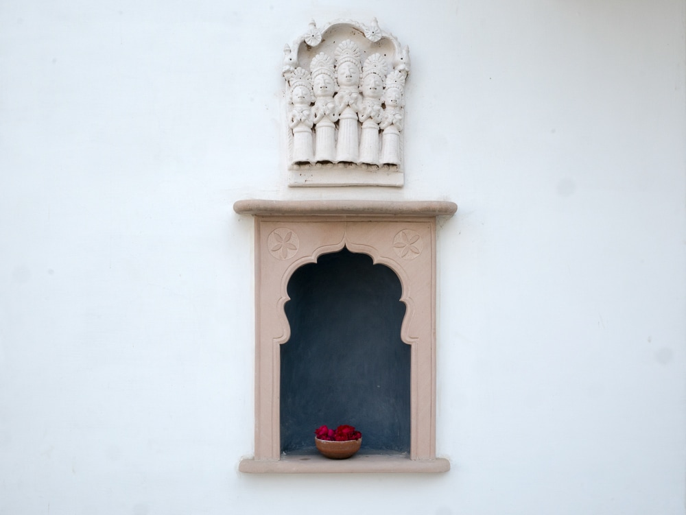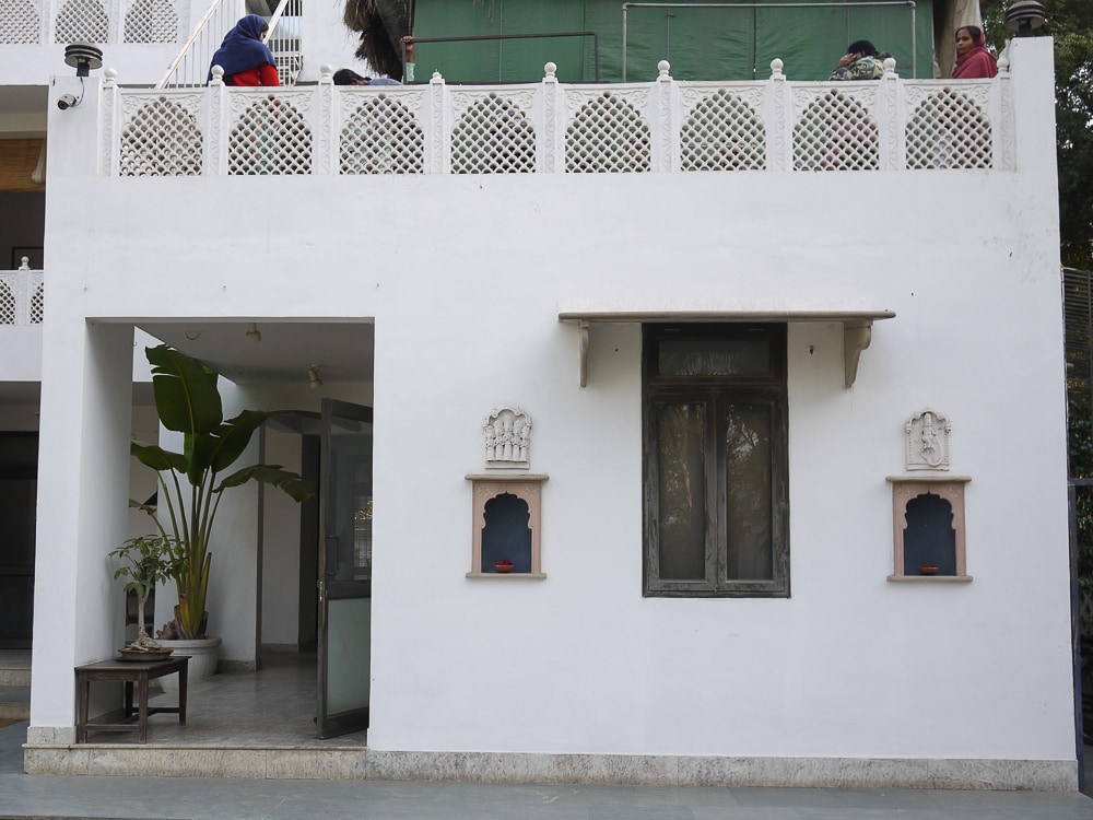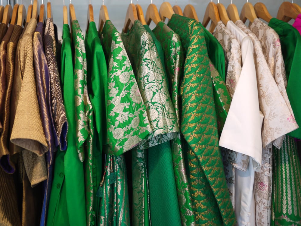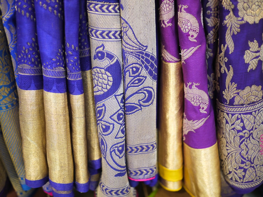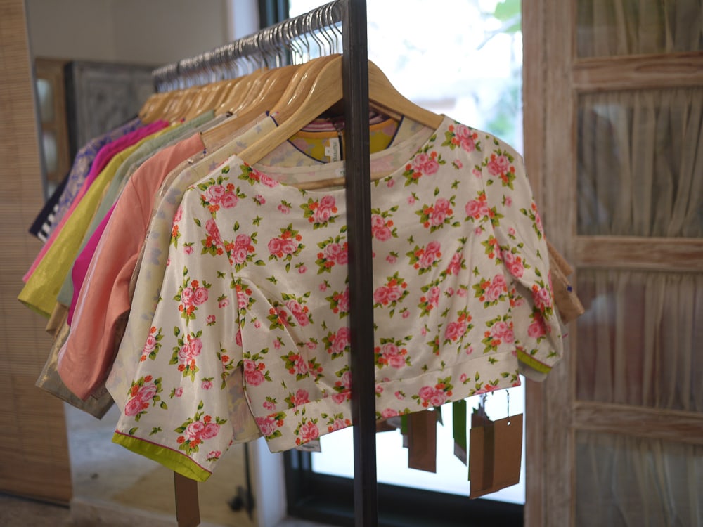 Garg’s workspace and showroom at the Ansal Villas at Angoori Badi Farm in the Chhatarpur area of New Delhi is all white and styled minimally. There is a low sofa, a natural wood table, and a jute mat on the floor. But when Sanjay opened the cupboards for us on a recent visit, a bright burst of light and rainbow of colors spilled forth. Neatly stacked silk saris and dupattas were swept from the cabinet and arrayed in front of us for our admiration.