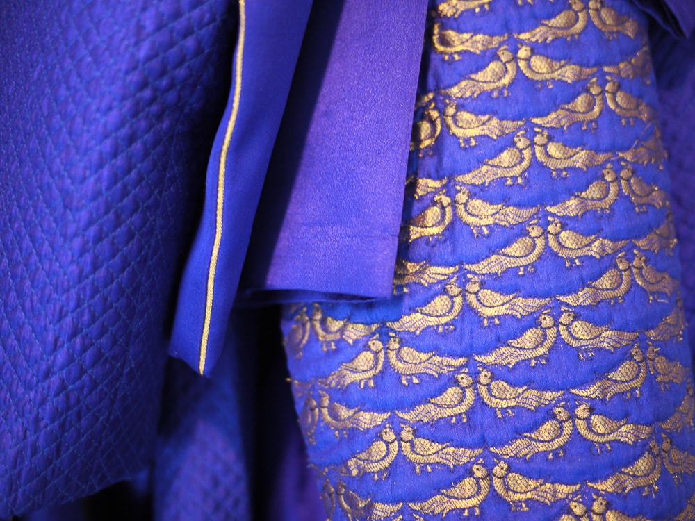 In addition to creating textiles for draped saris for Raw Mango, Garg also designs Sanjay Garg, a stitched collection inspired by traditional Asian shapes. “This shape came from the Middle East. If you make it very long, it's called an abaya, and when you make short it is Indian shape. And, if you make the shape bigger it becomes a kimono if it’s cut in this way. If you make this into a triangle, it becomes a Chinese garment,” he said pointing to the gridded shape on the cover of his lookbook. “Everything is worked around this Asian garment shape. So my inspiration is really my love of history and culture.”