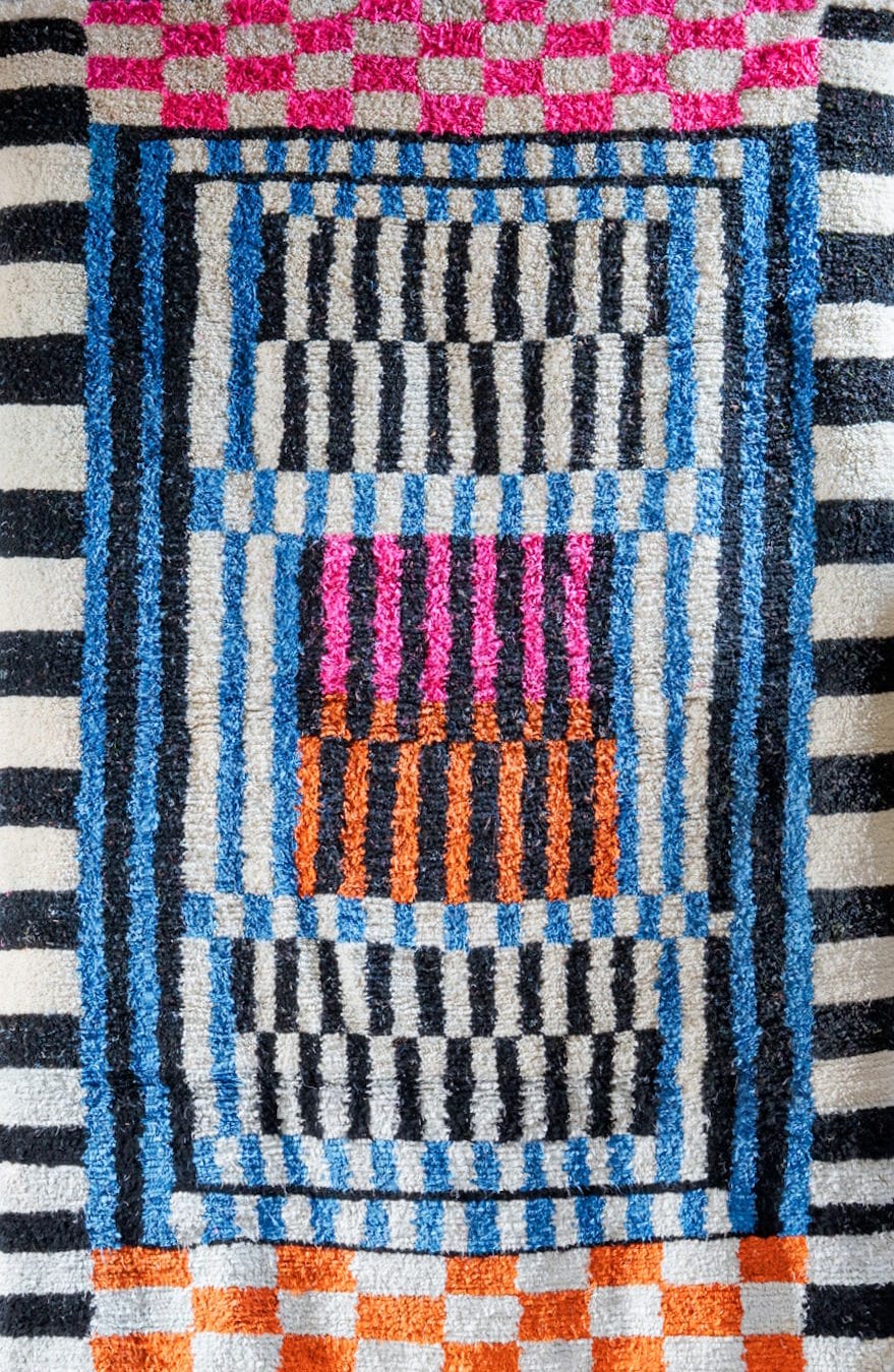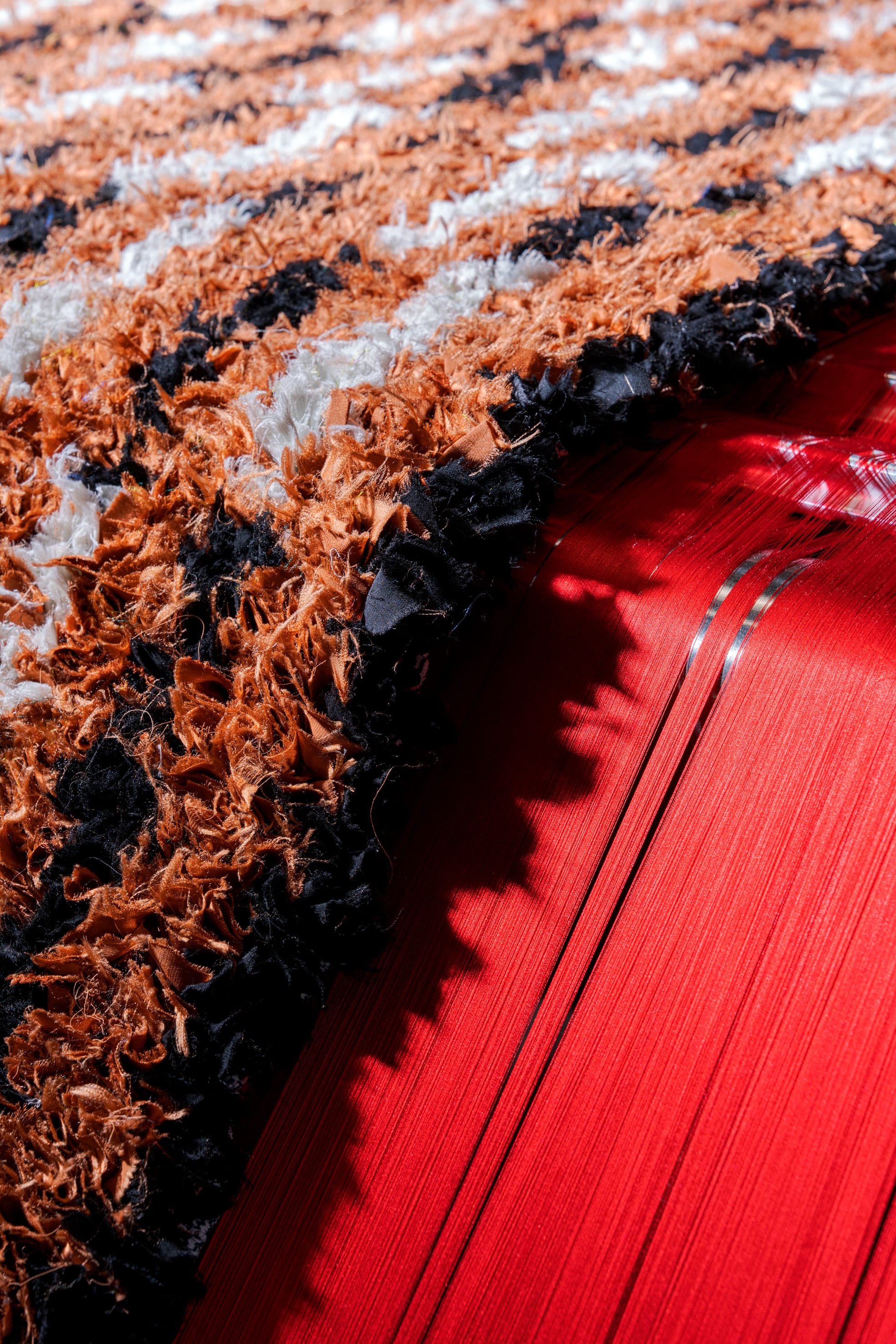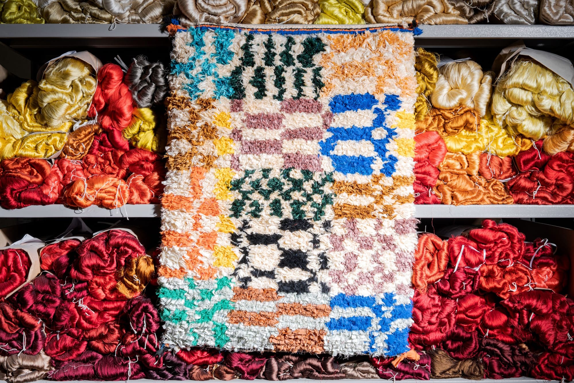 Casa Amar works with artisans in Azilal, Morocco who meticulously hand-craft Boucherouite rugs woven together with the personality of the maker and centuries of history. Traditionally, these rugs are made with the scraps of used clothing and Casa Amar's founders, Jihane and Matteo, wondered: "How can we honor this Moroccan tradition and elevate its beauty?" Through their collaboration with the esteemed silk-weaving mill founded in 1880 in Como, Taroni, Casa Amar was able to create an elevated product while respecting their Moroccan roots and their vibrant cultural identity.