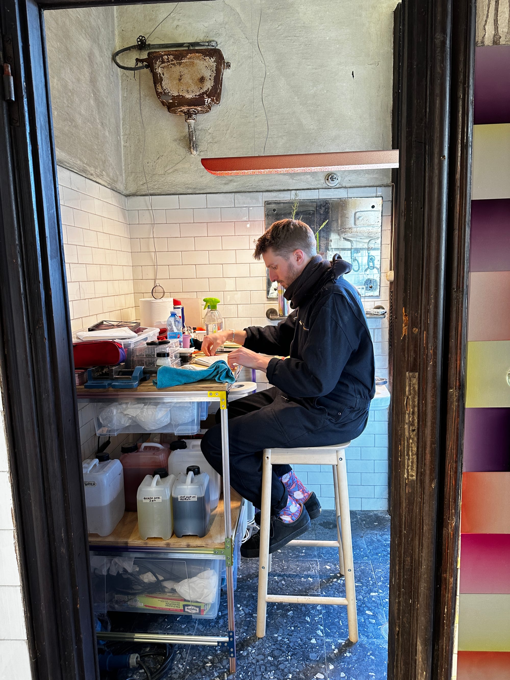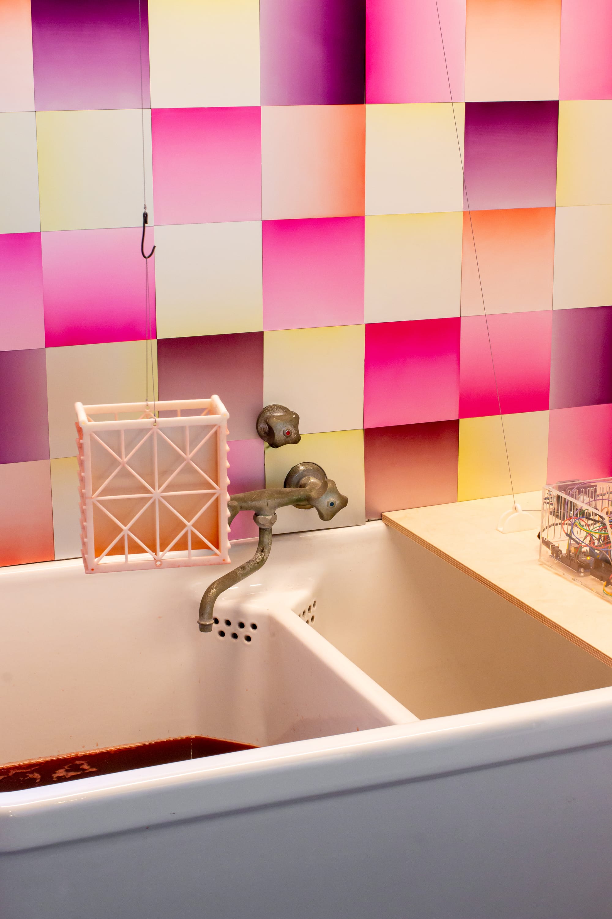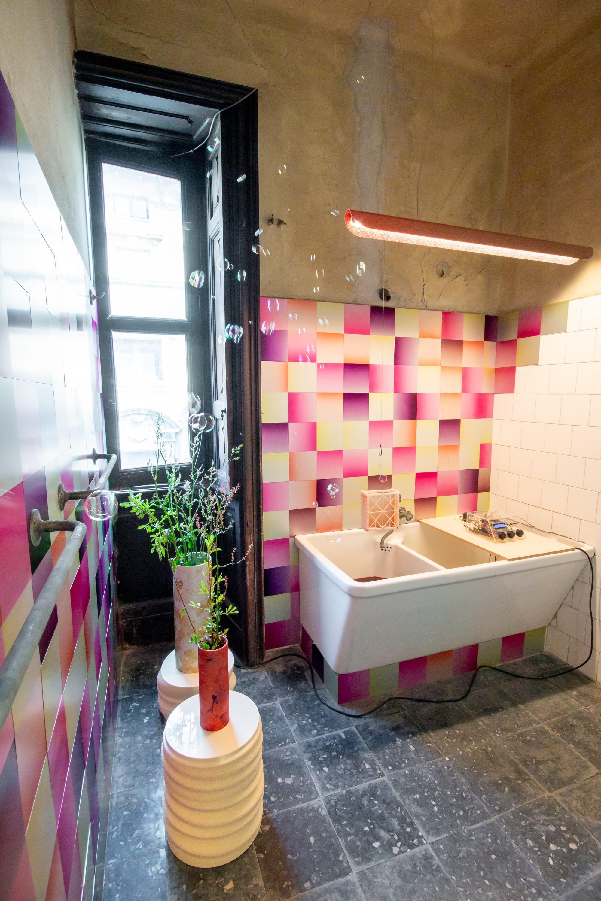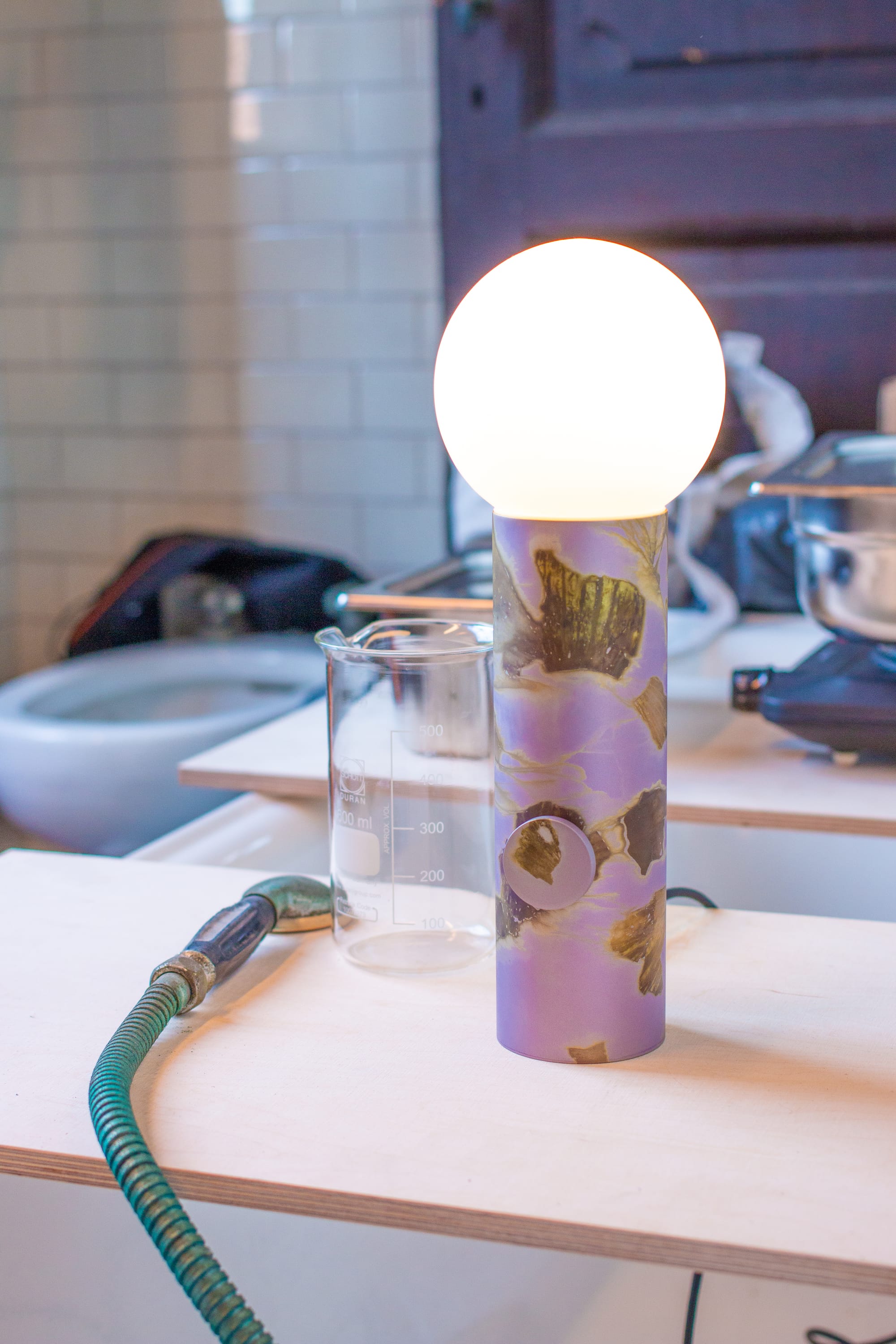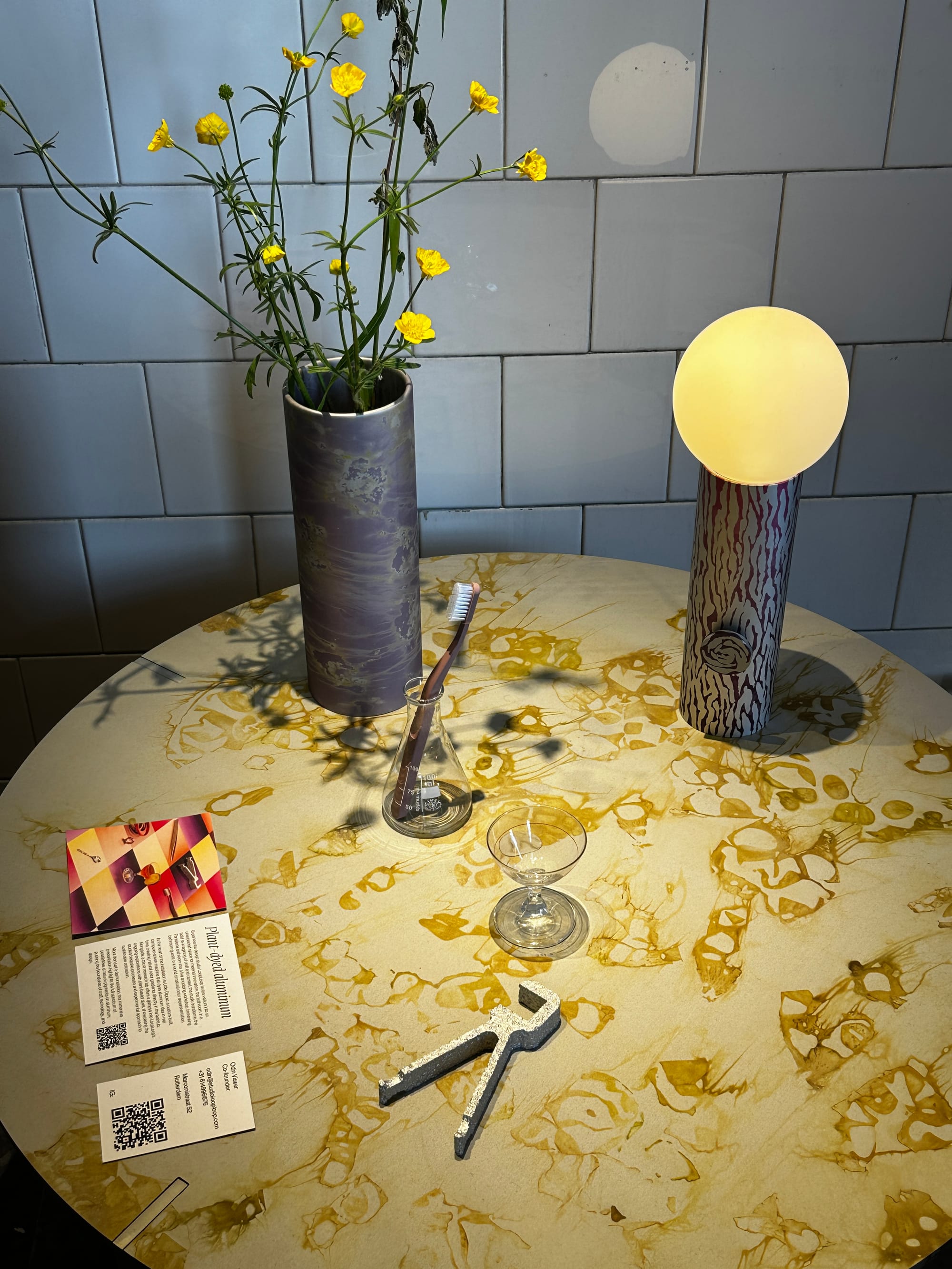 The studio transformed the foresteria bathroom into a live anodizing workshop, immersing guests in natural color experimentation. Central to the installation is Little Dipper, a machine that dyes aluminium tiles in real time, creating fluid gradients directly in the bathtub. Nearby, a micro lab showcases LoopLoop's explorations with plant-based dyes highlighting unique sustainable coloration processes. As the week progressed, anodized tiles, lamps, and vases filled the space, creating a vibrant canvas of botanical hues. This immersive experience demonstrated the potential of natural pigments on aluminum – challenging craft, technology, and design limits from a local production perspective.