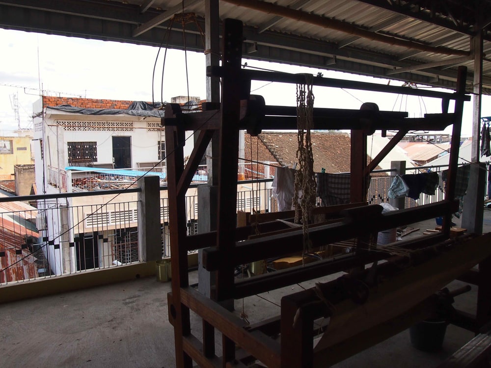 Over the course of a weekend, with nothing but the diagram to go off, Morrison built a timber replica loom and began teaching himself how to weave. The elegant mechanism, which uses a wheel attached to an adjacent wall to feed six spools of twisted thread or rope into the warp, is still in action today, set up on the rooftop of Bric-a-Brac overlooking the sleepy streets of Battambang.