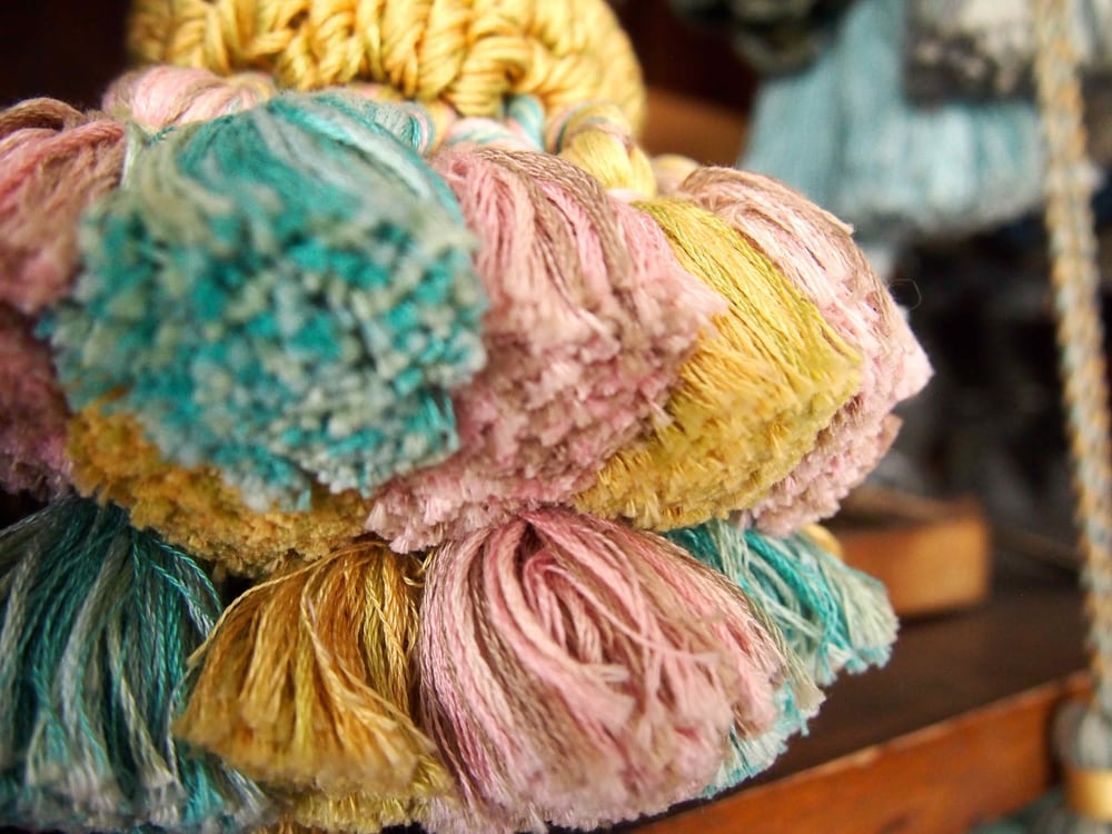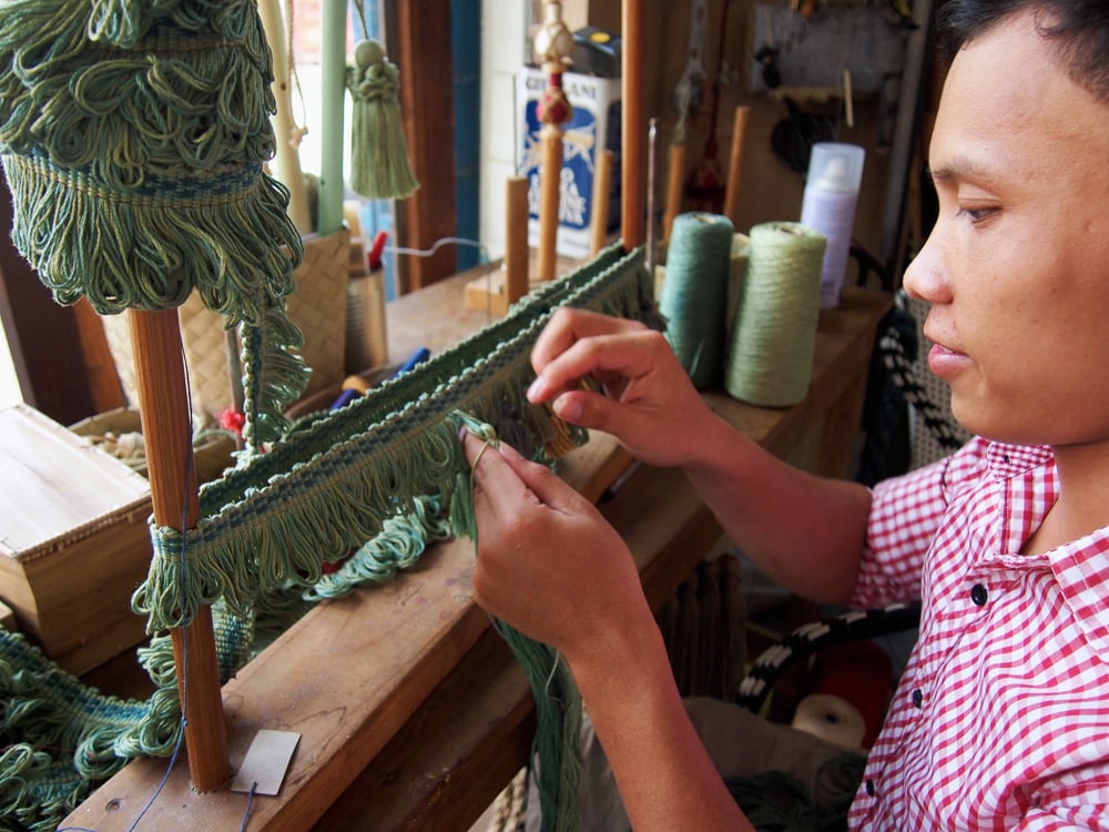 Once a colonial outpost and now a creative city that’s home to Cambodia’s highest number of artists per capita, Battambang fuses old-world charm with contemporary creativity. It might just be the perfect place to revive passementerie. Bric-a-Brac occupies a grand four-story corner building in the centre of town. The shop floor that opens onto the pavement is reminiscent of a Parisian boutique, which is where Morrison first fell in love with passementerie while travelling around France in 1990. After building that first loom a year later, he made the decision to transition away from a successful soft furnishings and upholstery business and dedicate himself to tassels and trimmings.