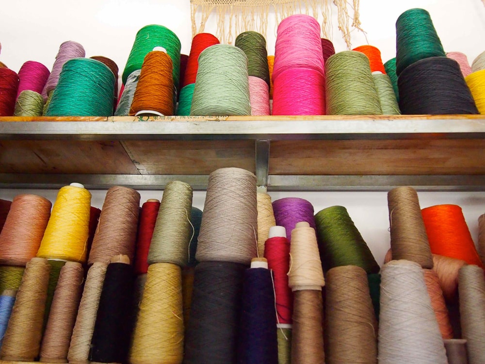 Reminders of that period can still be found lying around Bric-a-Brac – in the boxes of 120-year-old Irish linen that Morrison found at a Sydney market and carted all the way to Cambodia. Most of the other materials he uses – including gnarly jute, un-gummed silk and mercerised cotton – are all sourced across the border in Bangkok. Morrison has accumulated a color library of more than 600 thread hues.