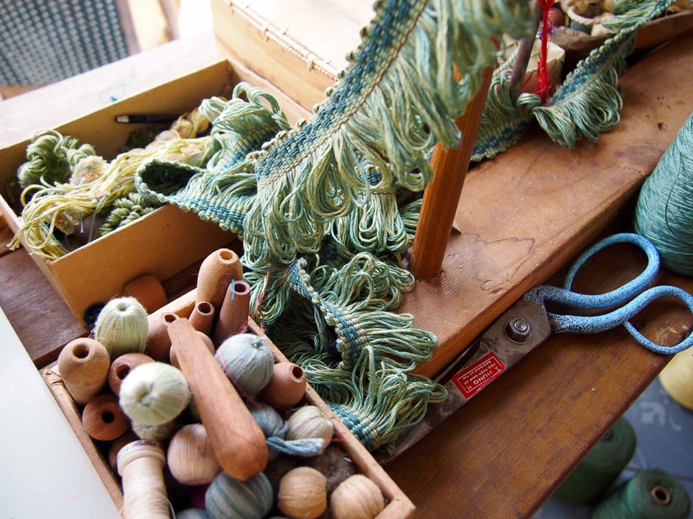 As he runs through the anatomy of a tassel, Morrison highlights the combination of hard and soft elements. Head and body are created by wrapping, binding and netting threads over a timber or metal mould – or sometimes the mold is left exposed. A cord relief element and super-fine, velvet cut ruff can be added before the transition to a bullion skirt (thick fringing). Some of Morrison’s designs incorporate Burmese lacquerware and hand-turned wooden moulds; others use locally made beads or foraged seed pods. Some tassels end up being attached to woven braiding trim, itself a highly textured, three-dimensional panel of layered threads.