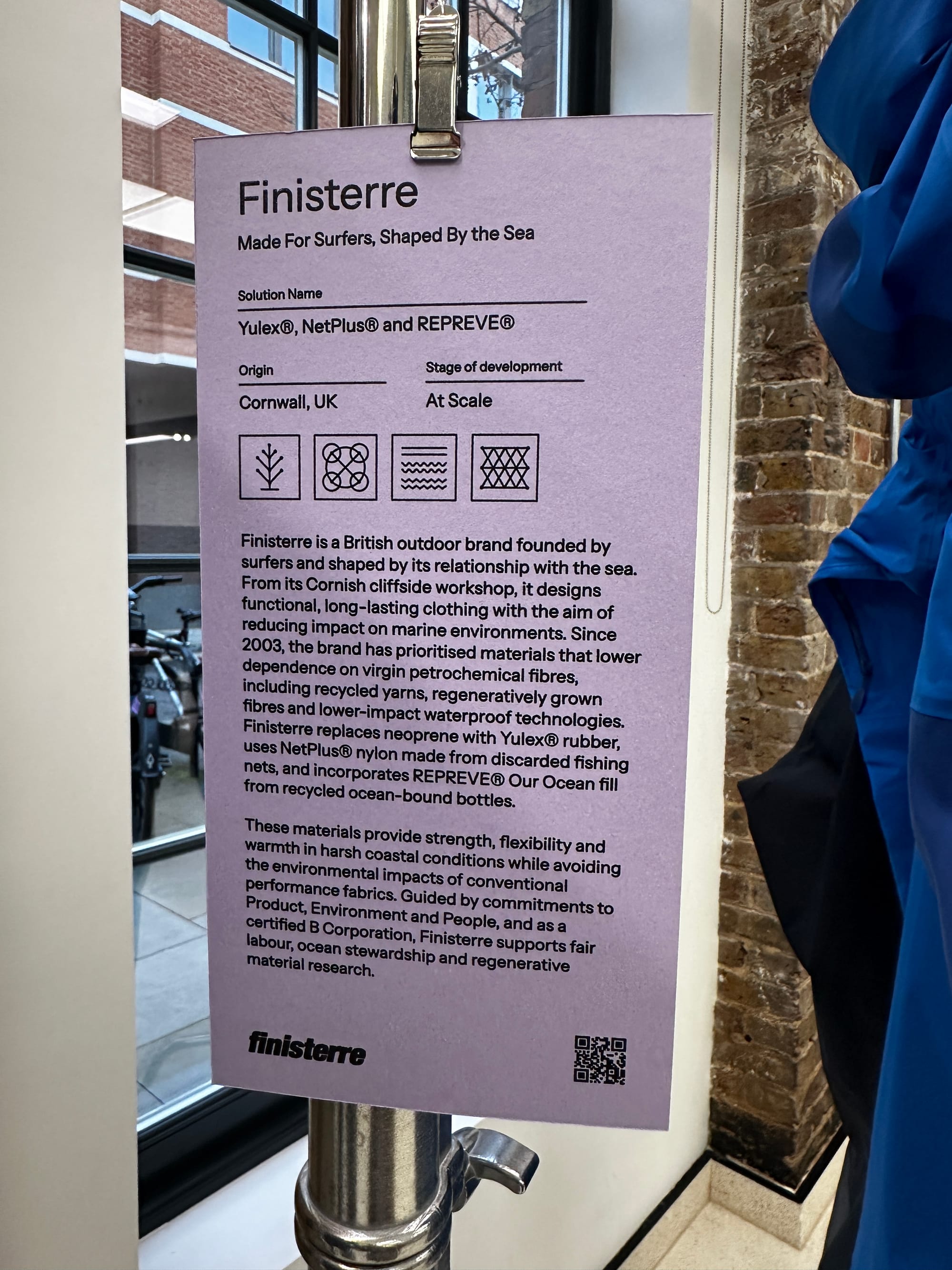 Yulex was originally pioneered by Patagonia and has been adopted by several brands including Finisterre. The British outdoor brand founded by surfers showcased their Yulex wetsuit at the Performance Without Toxicity exhibition. Since 2003, Finisterre has prioritized materials that lower dependence on virgin petrochemical fibers. including recycled yarns, regeneratively grown fibers, and lower-impact waterproof technologies.