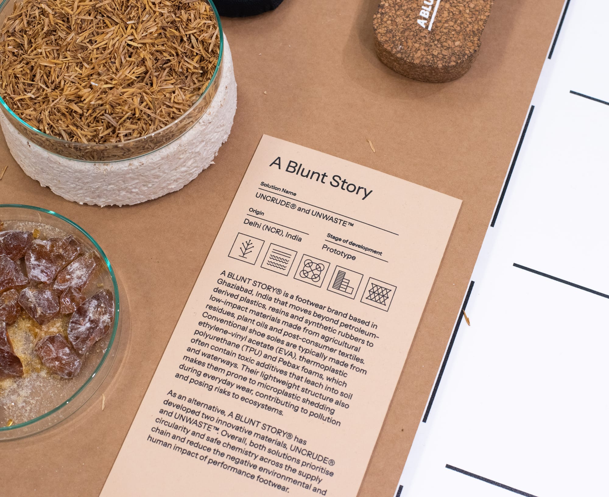 A Blunt Story is working with plant-based, plastic-free soles made from crop waste. The brand, which is based in Ghaziabad, India, aims to move beyond petroleum-derived plastics, resins and synthetic rubbers to low-impact materials made from agricultural resides, plant oils, and post-consumer textiles.