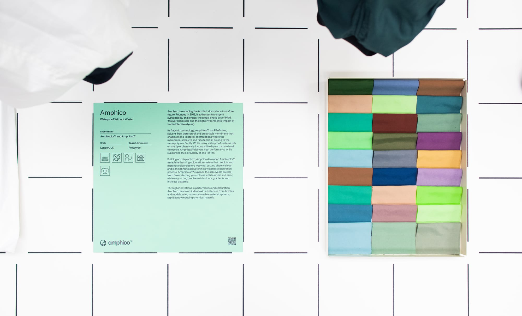 Amphico has developed PFAS-free waterproof, breathable textile technologies including its Amphitex™ membranes and Amphicolour™, a waterless coloration system that predicts and matches colors before weaving reducing chemical use and eliminating wastewater. Amphitex is a PFAS-free, solvent-free, waterproof and breathable membrane that enables mono-material constructions where the membrane, adhesive, and face fabric all belong to the same polymer family. While many waterproof systems rely on multiple chemically incompatible layers that are hard to recycle, Amphitex delivers high performance while supporting true circularity at the product's end-of-life.